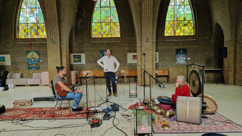 It was a period of ‘ups and downs’ between the first and the second round of recording in the chapel. However, in the end, it resulted in a beautiful co-creation with Tom Jaspers, an enthusiastic and sensitive musician, singer/song writer, guitarist. Coached and guided by Kenny, we created 2 wonderful tracks with guitar and (RAV) drum.